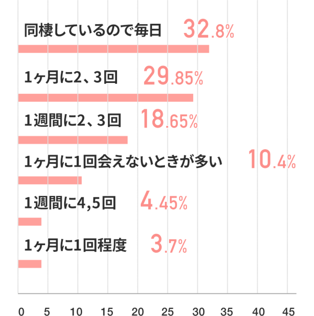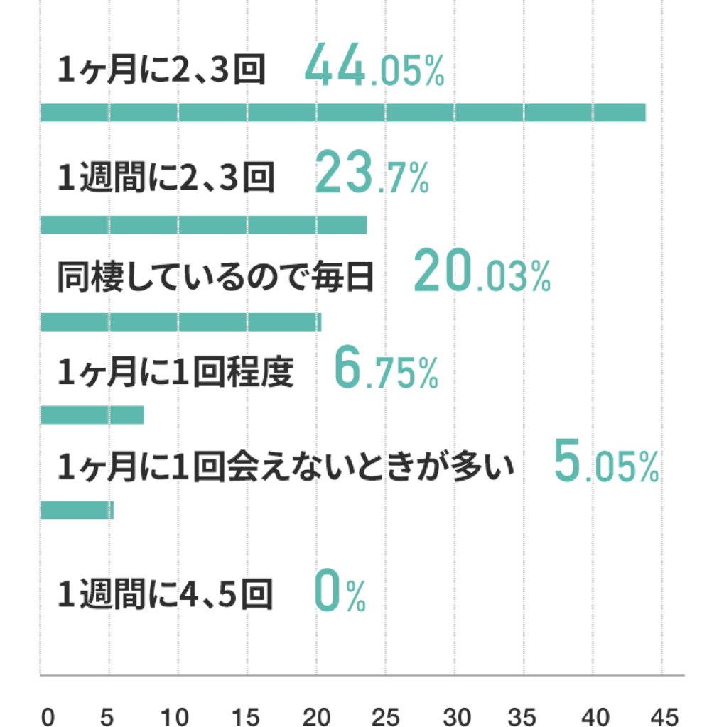 男性に比べて、交際期間の長さや同棲の割合から、これからの将来を考えて動いている女性が多いのかも。しかし、それに対して会う頻度が「1ヶ月に2、3回」と答えている人も男性 約44% 女性約30%と、比較的高い結果となりました。