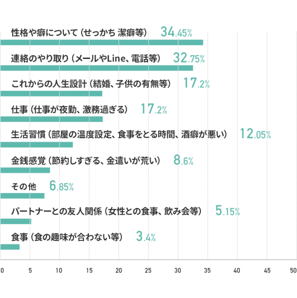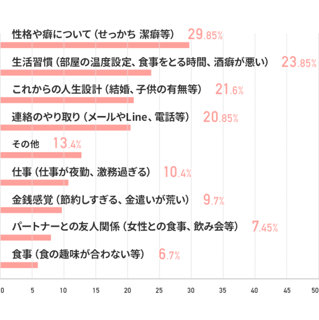 すれ違いについては「ときどきある」が男女共に1位という結果に! 順調と思いたいけれど、パートナーとの関係に充分満足しているとまで言えない人は意外と多いのかもしれません。ではその原因とは?