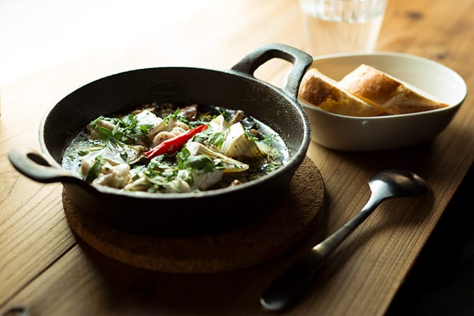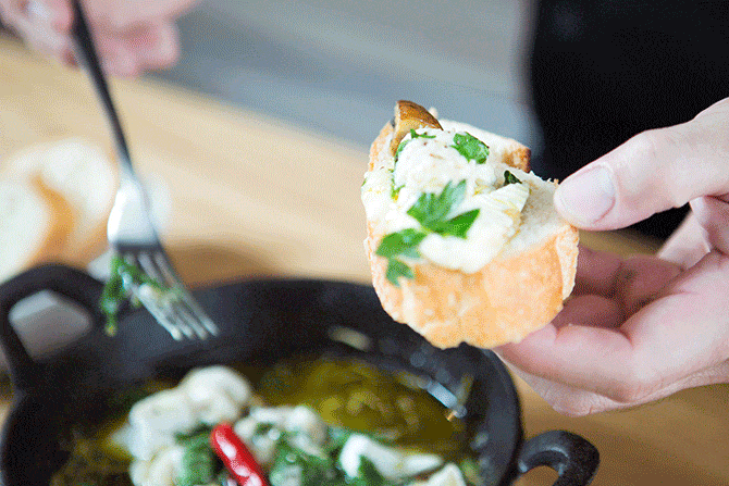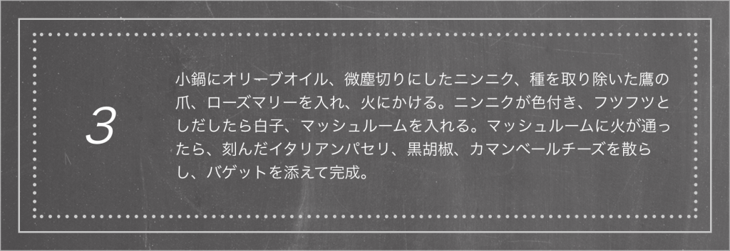 愛と同じで火加減に気をつけろ。炎上させては台無しだ。味付けは、バゲットと一緒に食べるので塩をしっかり目に味をシメて。このオイルをパスタに絡めてもイケるぞ。
